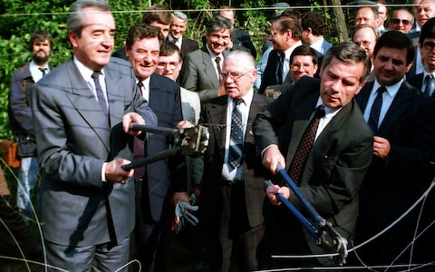 Alois Mock, el ministro de Relaciones Exteriores de Austria, con su homólogo húngaro, Gyula Horn, cortando el cable que marcaba la frontera entre el Este y el Oeste en Sopron, Hungría, el 27 de junio de 1989. Crédito: AP Photo / Bernhard J Holzner