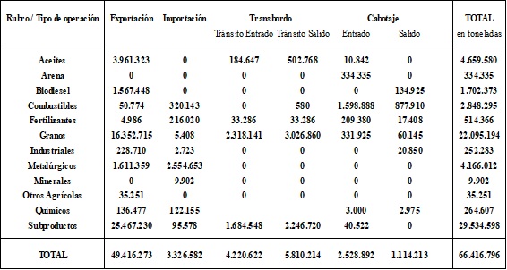 En el año 2014 se movilizaron por puertos localizados en la provincia de Santa Fe un total de 66,4 millones de toneladas de cargas no containerizadas; 79,9 millones de toneladas un año más tarde y 82,6 millones durante el año 2016, evidenciando el claro crecimiento del movimiento portuario santafesino. Más aún, para el año 2018, los datos preliminares trepan a 65,1 millones de toneladas, cifra promisoria considerando la importante pérdida de la producción agrícola provocada por la sequía que afrontó nuestro país. Se presenta a continuación un detalle de las cargas movilizadas durante el año 2014 según sus principales rubros, tipos de operaciones realizadas y volúmenes involucrados.