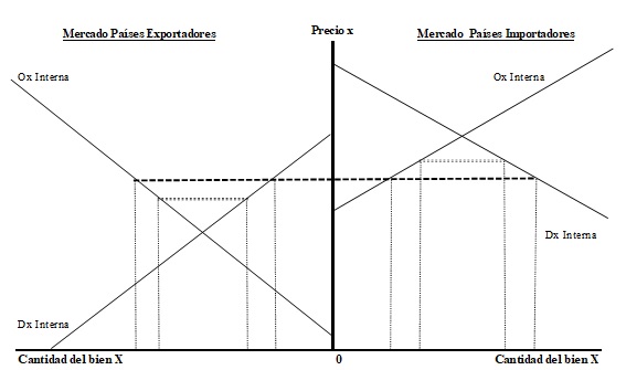 La siguiente figura describe los efectos de una reducción de los costos de transporte por medio del análisis de mercado de un determinado producto en naciones exportadoras e importadoras. Tras la disminución de los costos de transporte, el precio interno prevaleciente recibido por los productores aumenta en los países exportadores (línea punteada gruesa), alentando la cantidad ofrecida, y disminuye en las naciones importadoras estimulando el mayor consumo interno. De esta manera, en los países exportadores se manifiesta una expansión de su producción y de sus exportaciones, tanto en términos de volúmenes físicos como en valores monetarios. Se espera, además, un crecimiento de la demanda de los factores, —trabajo y capital—, requeridos en aquella mayor producción y, por ende, mayores niveles de ocupación de recursos humanos e inversiones. Por su parte, en las naciones importadoras aumentan las cantidades demandadas y las compras externas. Los menores costos de transporte permiten acrecentar el comercio en beneficio de ambos tipos de países (o regiones), especialmente para los millones de consumidores en los países importadores —al gozar ahora de un mayor excedente—, y para los productores de la nación exportadora.