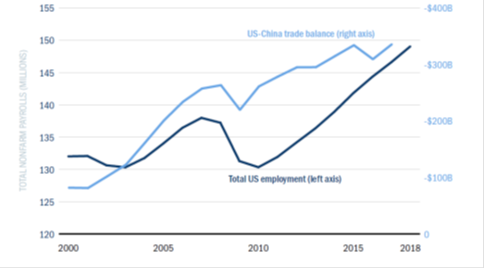 Gráfico 1: Correlación entre el crecimiento del déficit comercial estadounidense con China y el crecimiento del empleo.