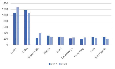 Gráfico 2: Principales poseedor de bonos del tesoro estadounidense en los años 2017 y 2020 en miles de millones de dólares.