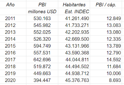 El PBI per cápita del 2011 fue de US$ 12.849 por persona. Para mantener la producción per cápita, la misma debería crecer al mismo ritmo que la población. Sin embargo el PBI per cápita del 2020 fue de US$D 8693. Si dejamos de lado el 2020, por la pandemia y tomamos el 2019 (sin pandemia), el valor es de US$ 10.006. Un 20% menos que una década antes. Si hubiéramos mantenido el ingreso por habitante del año 2011, en la década hubiéramos producido unos US$ 255 mil millones más. En diez años perdimos casi dos tercios de un PBI por caída de la producción. Esto es, US$ 5600 menos por habitante. Si no queremos meter el 2020 en la cuenta, 67 mil millones de dólares menos en una década.
