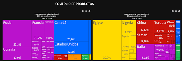 Francia exportó en 2019 el 7,12% del total de trigo del mundo (578 millones U$D). Italia importa trigo y exporta fideos.