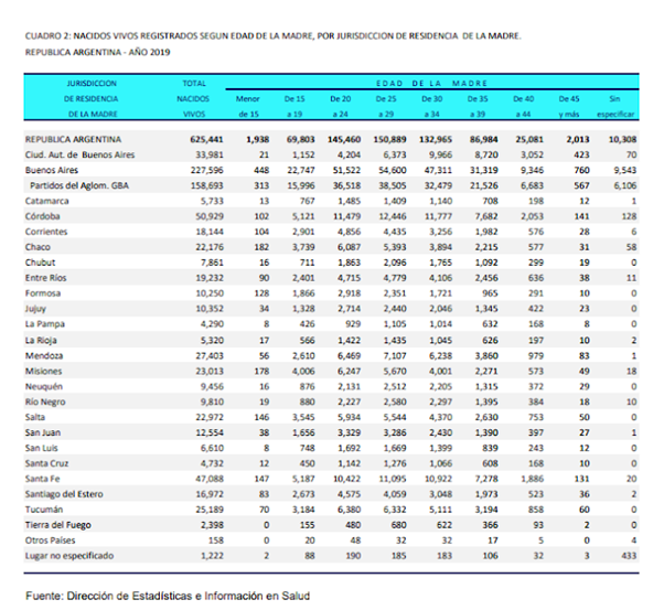 El segundo rango de edad de la madre que clasifican el INDEC y el Ministerio de Salud es de 15 a 19 años. Ahí los porcentajes bajan de 14% (2014) de los nacimientos a 11% (2019) en una caída sostenida. De acá puede venir el error del ex presidente Macri. En el año 2014 nacieron 108 mil niños de madre menor de 20 años. Se redujo paulatinamente y sin pausa hasta los 70 mil de 2019. Un tema adicional que puede inducir a error. Los cuadros estadísticos son presentados en rangos de 5 años (lo que es lo habitual y está bien; 0-4; 5-9; 10-14; 15-19; etc.). Pero para la ley argentina, a partir de los 18 años un individuo es adulto, desde la modificación establecida durante el gobierno de Cristina Fernández (antes era 21). Para la ley argentina nosotros somos niños desde la concepción hasta que tenemos 17 años y 364 días. Por lo tanto, en estos números (108 mil, 97 mil, 92 mil, 85 mil, 70 mil) hay madres menores (15; 16; 17 años) y adultas jóvenes (18 y 19 años). Si aplicamos ley de tres simple (que creo sobreestima el problema, ya que es más probable que haya más madres de 19 que de 17), entonces los embarazos de madres menores de edad rondarían los 50 mil casos anuales de un universo de 600 mil nacimientos.