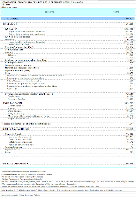 Primero la AFIP dice que fueron $ 11.906.730.771.054. Luego en una coqueta nota al pie, aclara que además recaudó $ 245.456 millones de Aporte Solidario y Extraordinario (el impuesto por “única” vez de 2021). Con lo que supera holgadamente los 12 billones —continentales— de pesos.