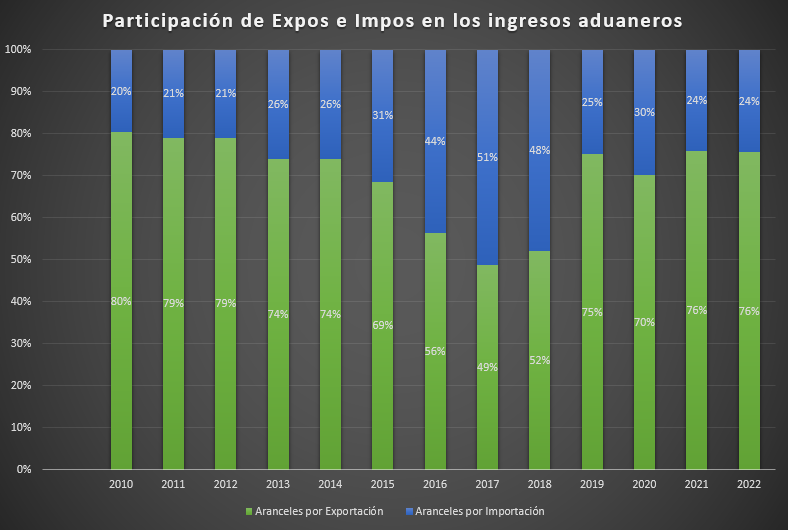 Del período 2010-2022, sólo un año (2017) tuvo mayores ingresos por aranceles de importación que de exportación (51%/49%). Todo el resto los aranceles por EXPO superaron y con largueza los de importación, con un pico de 20% (impo) – 80% (expo) en el 2010 y un promedio de 30% (impo) – 70% (expo).