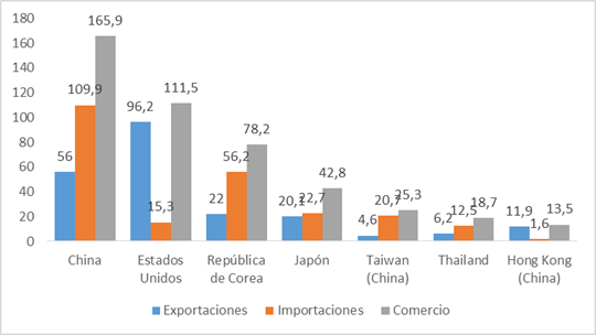 Gráfico 1: Principales socios comerciales de Vietnam en miles de millones de dólares en 2021.