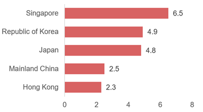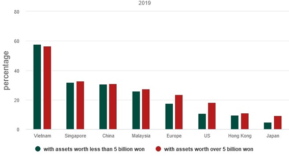 Más de la mitad de los 400 surcoreanos con activos por valor de más de 831.000 dólares expresaron interés en inversiones inmobiliarias en el extranjero, según el Informe sobre la riqueza de Corea 2019 publicado por KB Financial Group Research Institute, un grupo de expertos financieros privados. De estos, el 57,1% dijo que quería invertir en Vietnam, seguido de Singapur (32,1%), China (30,7%) y Malasia (26,4%). Entre aquellos con activos totales por valor de menos de 4,16 millones de dólares, que representaron el 60% de los encuestados, el 57,6% dijo que prefería los bienes raíces vietnamitas, seguido por Singapur (31,8%), China continental (30,6%), Malasia (25,9%), Europa (17,6%), Estados Unidos (10,6%), Hong Kong (9,4%) y Japón (4,7%). Entre el 40% restante con activos por valor de más 4,16 millones de dólares, el 56,4% expresó su interés en invertir en el mercado vietnamita, seguido por Singapur (32,7%), China (30,9%), Malasia (27,3%), Europa (23,6%), Estados Unidos (18,2%), Hong Kong (10,9%) y Japón (9,1%). (Ver gráfico 3) (Nguyen Quy, 2019)