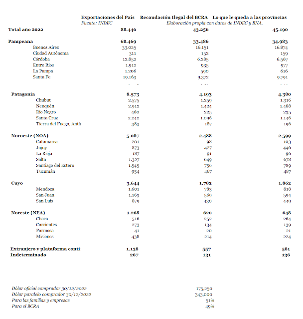 El BCRA les quitó a los changuitos misioneros la friolera de 214 millones de dólares sólo en el 2022. Y 225 MM de U$D a los rionegrinos, y 98 MM U$D a los catamarqueños. Hay que meter mucha gente presa.