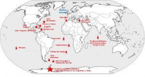 De norte a sur se encuentran Ascensión, Santa Helena, Tristán da Cunha y en el Atlántico Occidental la ocupación ejercida sobre las islas Malvinas, Georgias y Sandwich del Sur, reclamadas por la República Argentina.