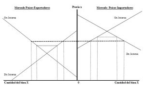 La siguiente figura describe los efectos de una reducción de los costos de transporte por medio del análisis de mercado de un determinado producto en naciones exportadoras e importadoras. Tras la disminución de los costos de transporte, el precio interno prevaleciente recibido por los productores aumenta en los países exportadores (línea punteada gruesa), alentando la cantidad ofrecida, y disminuye en las naciones importadoras estimulando el mayor consumo interno. De esta manera, en los países exportadores se manifiesta una expansión de su producción y de sus exportaciones, tanto en términos de volúmenes físicos como en valores monetarios. Se espera, además, un crecimiento de la demanda de los factores, —trabajo y capital—, requeridos en aquella mayor producción y, por ende, mayores niveles de ocupación de recursos humanos e inversiones. Por su parte, en las naciones importadoras aumentan las cantidades demandadas y las compras externas. Los menores costos de transporte permiten acrecentar el comercio en beneficio de ambos tipos de países (o regiones), especialmente para los millones de consumidores en los países importadores —al gozar ahora de un mayor excedente—, y para los productores de la nación exportadora.