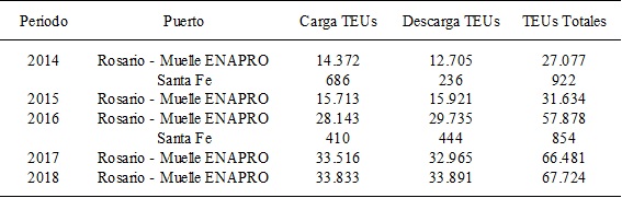 De manera complementaria, el movimiento de cargas containerizadas en la provincia de Santa Fe, especialmente por parte de la operatoria del puerto ‘Rosario – Muelle ENAPRO’, muestra también una creciente actividad. En el año 2014 las cargas totales movilizadas por puertos santafesinos alcanzaron a 27 mil TEUs representando solamente el 1,6% del total nacional. La siguiente Tabla Nº 4 presenta la evolución de los movimientos de cargas containerizadas por puertos santafesinos entre el año 2014 y 2018, según carga y descarga de TEUs.