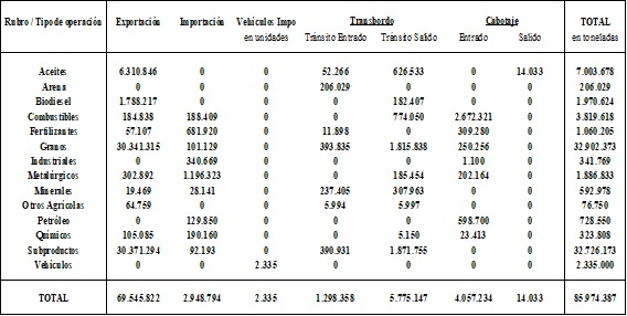 Del total de cargas movilizadas por puertos santafesinos, las involucradas en operaciones de exportación de mercancías superaron los 69,5 millones de toneladas, un volumen equivalente al 80% del total. Las importaciones alcanzaron a 2,9 millones de toneladas a las cuales se debe adicionar las correspondientes a vehículos automotores (2.335 unidades). Complementariamente, las operaciones de transbordo, que implica la transferencia de cargas de un barco a otro, de ‘tránsito de entrada’ fueron de 1,2 millón de toneladas, mientras que las de ‘tránsito de salida’ totalizaron otros 5,7 millones de toneladas. Además, las operaciones de cabotaje, es decir aquellas realizadas entre diferentes puertos de un mismo país, de tipo ‘entrado’, sumaron 4 millones de toneladas, siendo marginales las de ‘salido’. Se aprecia de esta manera la alta incidencia relativa de las operaciones de comercio internacional, especialmente de exportación.