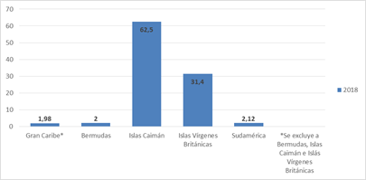 La concentración de la IED china por país de destino, actividad y empresa emisora constituye la principal limitación para la profundización real de los vínculos económicos China – Gran Caribe. El relacionamiento bilateral de los países caribeños con China y su limitada capacidad negociadora, resultan elementos que impiden una mejor distribución de los paquetes de financiamiento que ofrece China a la región. Incluso los proyectos de IED en el marco de BRI son muy escasos. Hasta el momento el 62,5% del volumen total de IED china ocurre en Islas Caimán, centradas en el sector financiero y luego le siguen las islas Vírgenes Británicas. Exceptuando estos dos países y Bermudas, el resto del Gran Caribe recibió en el 2018 menos del 2% de la IED en América Latina y el Caribe (imagen seis).