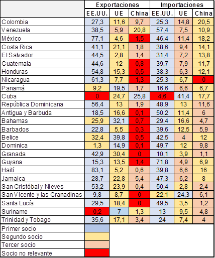 La historia de los países del Caribe ha estado vinculada con Francia, Reino Unido, Estados Unidos, España y Países Bajos. Con el transcurso de los años, este pasado se ha convertido en preferencias comerciales que son decisivas en el destino de las exportaciones. En la mayor parte de las economías los servicios turísticos y financieros son las principales categorías de actividad económica, además de las relacionadas con petróleo en Trinidad y Tobago. La principal característica de los países en el Caribe es la diversidad. En ello inciden diferentes niveles de relacionamiento económico-financiero e incluso de cooperación. China ha establecido importantes relaciones institucionales en América Latina a través del BID y la CEPAL.