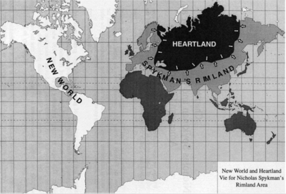 Señalaba en su libro el alto significado del “anillo marginal”, “zona de circunvalación” o “shatterbelt”[5] que rodeaban a la masa territorial en la que se aposentaba “la esencia del poder mundial”, que permitiría la supremacía mundial. Según el profesor americano, quien controla el “rimland” mantendría aislada y sin posibilidad de expansión a la potencia que dominara a la “Tierra Corazón”.