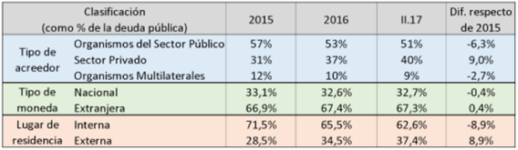 Como se detalla en el cuadro 1, en cuanto a la composición de los acreedores entre 2015 y el segundo trimestre de 2017, se observa un cambio respecto del kirchnerismo. Aumentó la participación de la deuda en manos del sector privado (bonistas), en desmedro de las colocaciones a organismos del sector público nacional (como, por ejemplo, la ANSES, el BCRA o el Banco Nación) y, en menor medida, a los organismos multilaterales (FMI, Banco Mundial, Banco Interamericano de Desarrollo, entre otros).