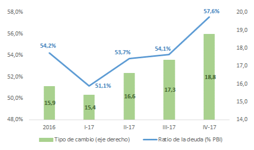 La manera más utilizada para medir la deuda es a partir de su relación con el tamaño de la economía (PBI), sin embargo este indicador tiene un gran problema ya que su evolución está estrechamente vinculada con las variaciones que se observan en el tipo de cambio. Y así como esto impulsó el porcentaje varios puntos hacia arriba tras la devaluación de fines de 2015, lo mismo se volvió a observar, aunque a una escala mucho menor, a fines de 2017.