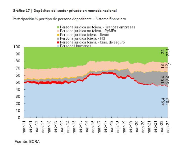 - Cancelar las LELIQs con dinero. Depositar los pesos. Hay vencimientos diarios. En siete días todos quedan pagos y la deuda en pesos del BCRA pasa a ser cero. La amenaza actual de banqueros y funcionarios corruptos es la siguiente [2]: «si el gobierno corta las letras del BCRA, todo se irá al dólar, el valor de la divisa se triplicará (quintuplicará, multiplicará por X), el país volará por los aires. “Desolación”. “Muerte”. “Tragedia”». Amenazas huecas. Lo traté en EL ELEFANTE SE COME EN PEDACITOS. La mayoría del dinero hoy depositado es de privados comerciales que necesitan ese dinero para sus pagos corrientes. Lo tienen a tasa para tratar de mitigar el efecto de la inflación (explicado en EL ELEFANTE SE COME EN PEDACITOS). Si alguno quiere comprar dólares, lo hará con lo que cobre de sus plazos fijos luego de abonar sus obligaciones corrientes (ya volveré sobre esto). El resto de los depósitos el sistema bancario (los que no son de familias o empresas) son o del gobierno o de los bancos. En estos dos últimos casos el estado controla el destino de esos fondos.
