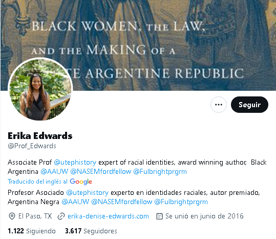 Erika Denise Edwards ha publicado un libro —según ella premiado— titulado Hiding in plain sight. Black women, the law, and the making of a white Argentine Republic (Escondiéndose a plena vista. Mujeres negras, la ley y la construcción de una República Argentina blanca). Ese mismo texto está en la imagen de su cuenta de Twitter.