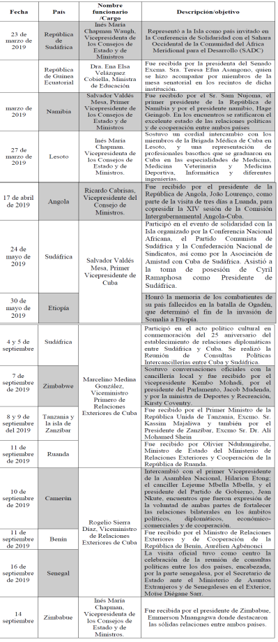 Tabla 5. Resumen de las visitas de alto nivel de funcionarios cubanos a países africanos en 2019.