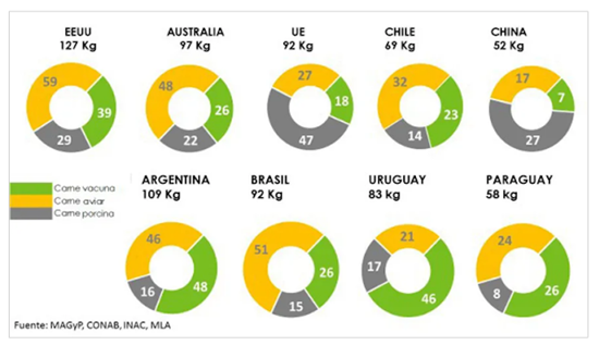 Consumo de carnes diferentes países. Fuente: ex Ministerio de Agricultura y Ganadería de la Nación.