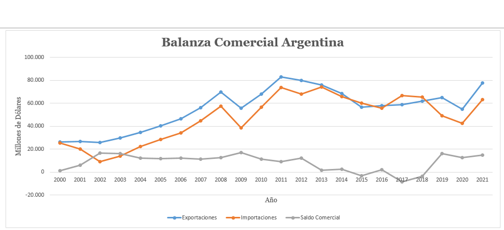 Las exportaciones argentinas han crecido a paso sostenido en lo que va del siglo XXI (desde US$ 26.543 MM en el 2001 a US$ 77.934 veinte años después, en el 2021). Ha sido consecuencia de los cambios en el comercio internacional entre otras razones por el ingreso de China como gran importador de materias primas, alimentos y forraje.