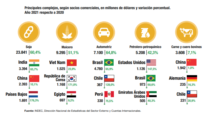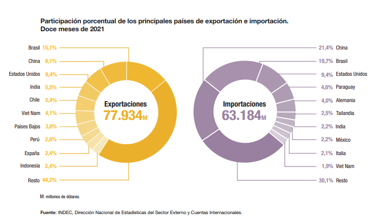 Brasil conserva el lugar de primer comprador. China es nuestro segundo cliente, si bien nuestro comercio con ellos es altamente deficitario. La novedad es EEUU como cliente nuestro e India y Viet Nam como nuevos mercados. La relación con Chile es de larga data.