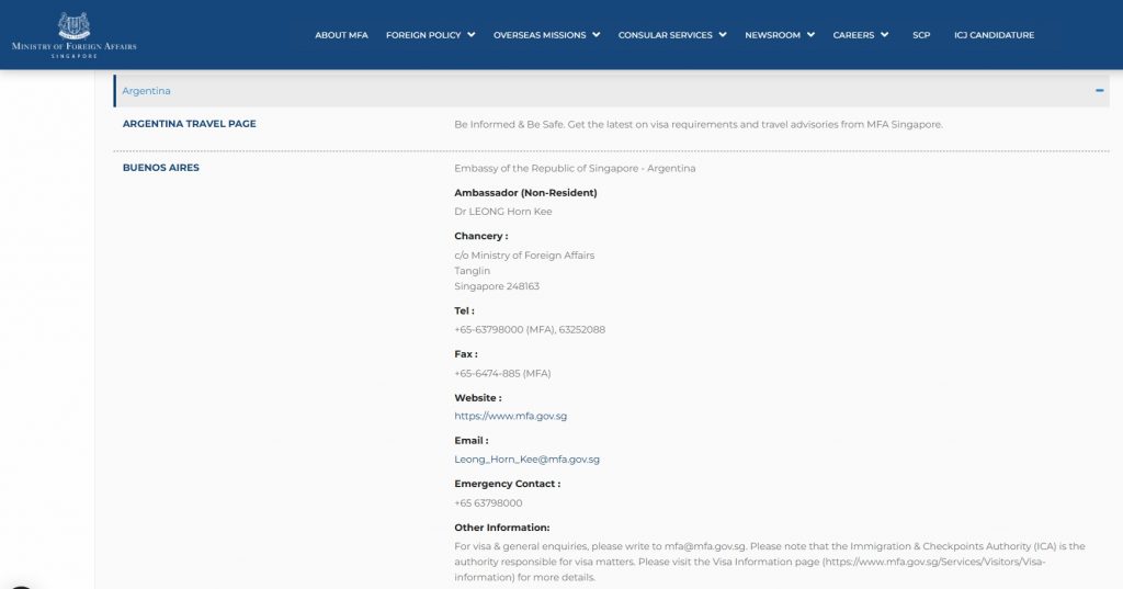Página oficial del Ministerio de Asuntos Exteriores de Singapur en la que destaca que el Embajador Dr. LEONG Horn Kee es «no residente» y que su sede está en Singapur. Fuente: https://www.mfa.gov.sg/Overseas-Missions/Find-A-Singapore-Overseas-Mission?letter=a