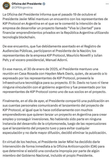 Extracto del extenso posteo de la cuenta en X de la Oficina del Presidente de la República Argentina (OPRA) del día 15/02/2025 confirmando las reuniones y deslindando al presidente de toda responsabilidad.
