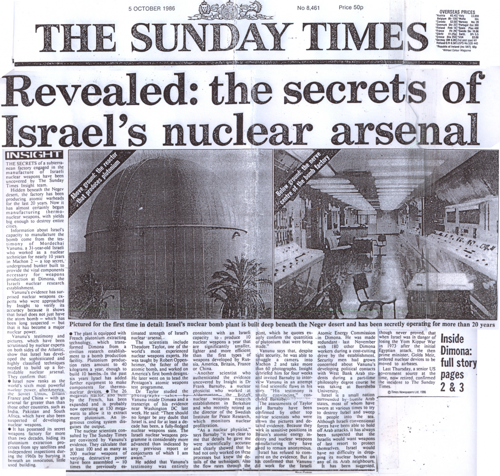 En septiembre de 1986 Vanunu le reveló al The Sunday Times que su país estaba en capacidad de producir armas nucleares. Esa publicación fue la primera en revelar los secretos nucleares de Israel al mundo después de que el periódico publicara filtraciones proporcionadas por el técnico israelí.