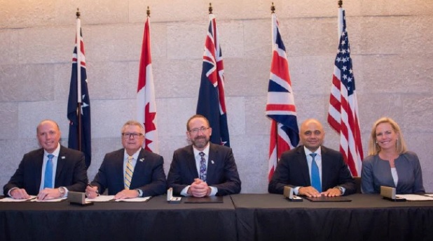 Reunión de Five Eyes en agosto de 2018. El Ministro de Asuntos Interiores, Peter Dutton, el Ministro de Seguridad Pública de Canadá, Ralph Goodale, el Ministro de Justicia de Nueva Zelanda, Andrew Little, el Ministro del Interior británico, Sajid Javid, y el Secretario de Seguridad Nacional de los Estados Unidos, Kirstjen Nielsen, en Gold Coast. En una declaración conjunta, los ministros dijeron que los gobiernos extranjeros, los actores y sus representantes estaban involucrados en “actividades coercitivas, engañosas y clandestinas” para “sembrar la discordia, manipular el discurso público, sesgar el desarrollo de políticas o perturbar los mercados”[34].