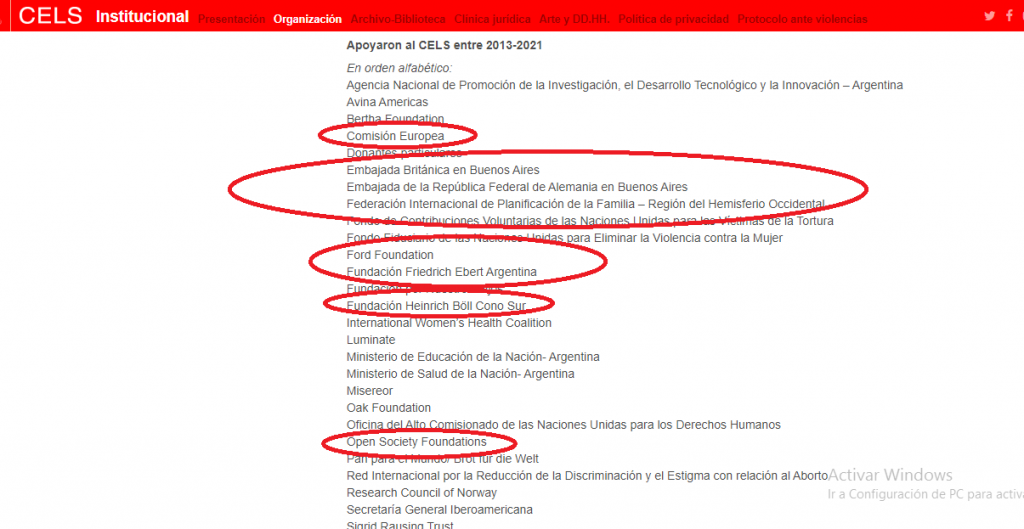 Permítanme hacer una digresión para destacar que Rafael Bielsa fue quien, como embajador en Chile, propuso a la justicia de ese país que el dirigente de la Resistencia Ancestral Mapuche (RAM), el muy aborigen Jones Huala (actualmente prófugo), podía cumplir su libertad condicional en la Argentina. Por su parte el CELS —ONG vinculada a Horacio Verbitsky— cuenta con la prerrogativa de impugnar el ascenso de los militares de las Fuerzas Armadas de la República Argentina y recibe financiamiento de la Embajada Británica en Buenos Aires, de la Embajada de la República Federal de Alemania en Buenos Aires, de la International Planned Parenthood Federation (ONG que actúa en defensa del acceso al aborto inducido y del libre acceso a los métodos anticonceptivos como medios de planificación familiar), de la Fundación Ford, de la socialdemócrata Fundación Friedrich Ebert Argentina (socialdemocracia alemana), de la Fundación Heinrich Böll (vinculada a Die Grünen, el partido de Los Verdes de Alemania), de la Open Society Foundations (George Soros), entre tantas otras organizaciones e instituciones que «se interesan» por la Argentina. También recibe fondos de ministerios de la Argentina como los de Educación y Salud de la Nación.