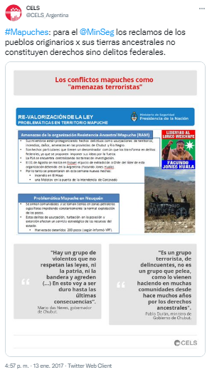 Que una ONG como el CELS, financiada por fundaciones extranjeras, por embajadas como las de Estados Unidos, Alemania y nada menos que el Reino Unido, se aboque a organizar nuestra Inteligencia es poner al lobo a cuidar el gallinero. A los efectos de mostrar su papel en los graves problemas internos que afectan a nuestros ciudadanos argentinos de la Patagonia, los siguientes tuits ilustran su postura anti patria.