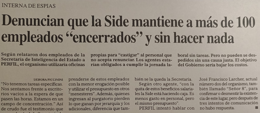 [13] «Denuncian que la Side mantiene a más de 100 empleados ‘encerrados’ y sin hacer nada». Perfil, 09/10/2005.