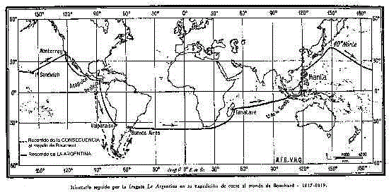 Itinerario seguido por la fragata “La Argentina” en su expedición de corso al mando de Bouchard 1817-1819.