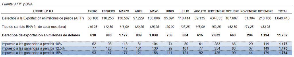 En el año 2022 los productores de bienes de exportación pagaron U$D 11.762 millones de DEX. Eso pasará a ser ganancias. Si tributan 10%, las provincias recaudarán en conjunto U$D 1.176 millones adicionales.